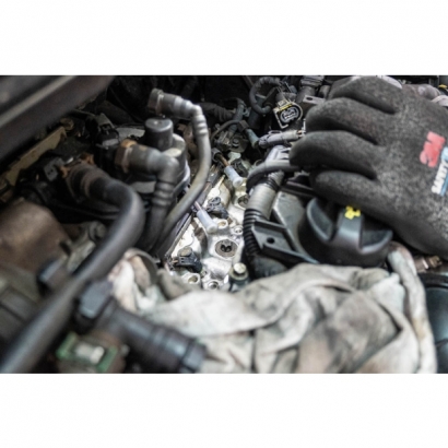 技師將噴油嘴與其配件都拆卸下來後,仔細清理噴油嘴和引擎室受影響的位置,並更換固定支架及墊片等周邊耗損配件。